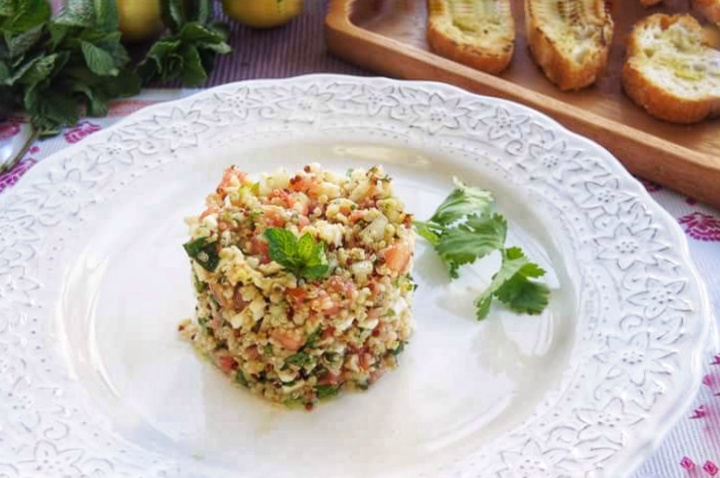 Una clásica ensalada de Siria y el Líbano, donde la combinación de diferentes hierbas aromáticas le dan un toque de lo más refrescante. Se suele preparar con cuscús, sin embargo, en esta ocasión lo he remplazado por quinoa: un cereal cada día más valorado, gracias a sus grandes aportes nutricionales. Queda de maravilla para una cena vegetariana.