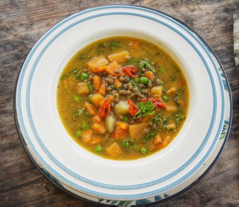 - Una vez que las lentejas estén suaves, añadimos las zanahorias, el zapallo y las patatas cortados en cuadraditos.