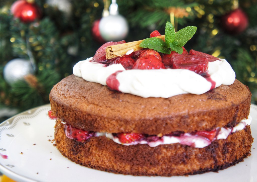 Como se imaginarán al final me deje llevar y termine preparando un bizcocho esponjoso al que le agregue algunas especias navideñas y un poco de miel caña. Lo acompañe con nata montada y las fresas al vino. En sí, un clásico short cake. Pero con un toque más fiestero, y que va de maravilla para las fechas en las que estamos.
