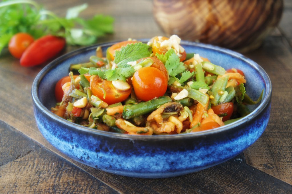 La ensalada Som Tam es originaria del noreste de Tailandia y es mucho más que una simple ensalada: es un emblema de la cocina tailandesa que combina tradición y frescura en cada bocado. Su base de papaya verde rallada, aderezada con una mezcla vibrante de sabores ácidos, dulces, salados y picantes, la convierte en una experiencia única.