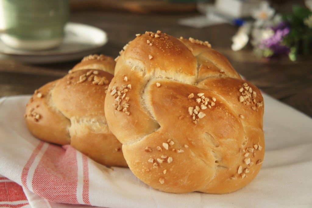 - Sacamos la masa del bol y, sobre una mesa de trabajo enharinada, la estiramos y damos forma. Yo dividí la masa en 6 partes iguales y formé 6 tiras uniformes, con las que hice dos trenzas. Luego, enrollé cada trenza sobre sí misma para hacer una linda bolita trenzada.