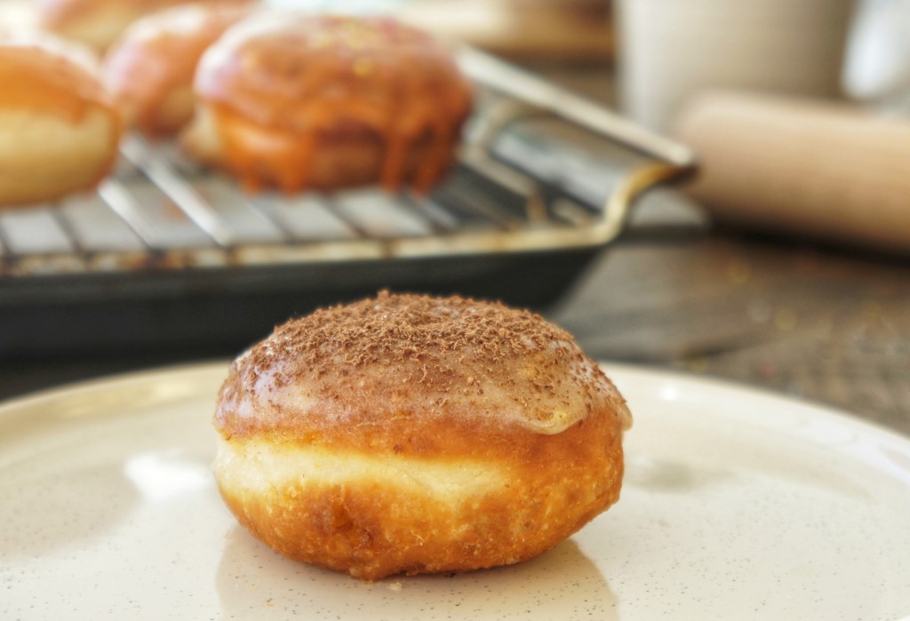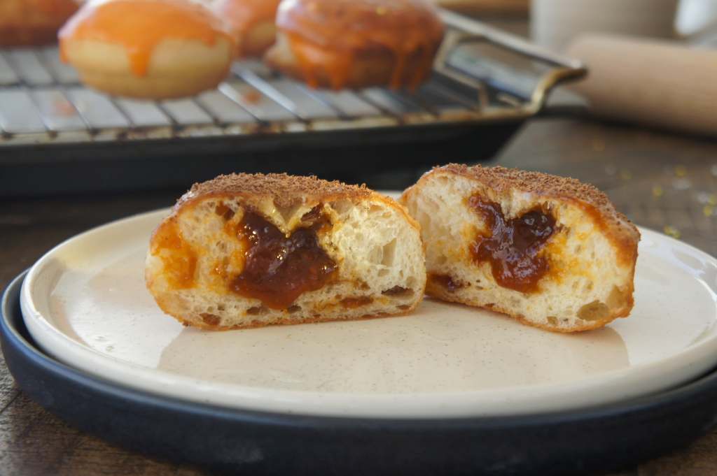 - Relleno y glaseado: Con una herramienta larga y delgada, hacer un orificio en la base de cada donut y mover en círculos para generar espacio para el relleno. Con una manga pastelera, rellenar los donuts con la mermelada de albaricoque.